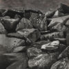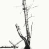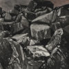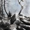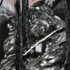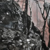 The surprising element lies in the perfect dovetailing of drawn and real forms, which shapes the overall appearance. The trees, huts, things are displayed in all their details, all their “naturalness”. At the same time everything there is to see is pure drawing, pure imagery. This is a forest, this is a picture. Yet it is a particular forest, a forest selected for this image, that I face. The precision of the depiction is foremost owed to the decision to capture the forest as a forest in winter or autumn, bare of leaves, preferably a birch wood. The deciduous forest has been deprived of its leaves. With this variation, this »different appearance due to the time of day and year«, the trees reach »an exceptional level of reality«. This, I would add to Brecht, is a reality, which is inherently excluded from our society, an Other elevated above an unvaried, linear, excessively self-celebratory social existence bare of any direction. These trees evoke something unsettlingly autonomous, something that turns away from me, something that cannot be exploited. The few leaves that can be seen, are in danger of vanishing in an enormous shadow; they can only be seen in the pale back light, or otherwise, they shimmer in a peculiar remoteness. Thus the branches gain significant power, they entirely destructure the picture, for they are without volume, they rather lash and reach out anywhere, in any direction, as an ideal drawing matter; or the tree stumps, that stretch themselves spasmodically upwards, signifying a time “lived out”. All these elements destabilise the space, they are obstacles, which render the whole impenetrable. The trees appear as simple textures, without flesh, without leaves, without life, any life seems to be withdrawn, or pointing downwards. Furthermore, they are often falling, or broken, derived of their foundation. Down there are immeasurable piles of stones. Stones, rocks, the pinnacles of the inorganic, provide a highly “uneven” ground, a persisting foundation. One cannot be certain as to why there are so many stones inside the forest at all. Perhaps we should consider an upheaval, a reversal, during which the world of rocks had eruptively hewn its way into the forest and taken all its life. A harsh world. On other pictures, then again, pine forests are the rule, trees which, despite their “evergreen” leaves throughout the year, represent an apparent resistance to the natural cycles, much closer to the unchanging, resistant nature of the rocks than the vital movements of plant life. In effect, this is a barren, lifeless or silenced forest, which one approaches as a viewer – or a stroller.