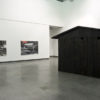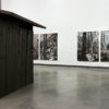 “Die Stille” (“The Silence”), “Die Höhle” (“The Cave”), “Die Insel” (“The Isle”), “Die Wälder” (“The Woods”) are titles of works by Sebastian Nebe, and they show exactly what they promise. I am drawn into a painting of a forest. Lured into visiting an exhibition by the literary pun “Romantischer Egoist” (“Romantic Egoist”), I find my way blocked by “Die Schwarze Hütte” – a huge, dark and real black lodge – before my gaze gets lost in the “Dämmerung” (“Twilight”). The space is filled with the promise that these places could be found in real life. Reminiscences of forest walks come to my mind. These hikes always had something magical and at the same time disenchanting about them; in our times, what we discover in nature are rarely wild animals, amazing plants or fresh springs, but rather traces of civilisation, waste left behind. These things, these facts of life and their remains bear witness to existence. Could this be a hint at a return? In his paintings, Sebastian Nebe captures the morbidly familiar with great atmosphere and with obvious consideration for physical effects. At the same time, he creates a mental distance to elements of drama through calculated references to art history. Meanwhile, the gaze trails off into the black and white images, sporadically intercut by patches of colour that mark the sky or a piece of tarpaulin. The ironic take on these scenes, mixed with what might be a pleasure in decay, are defining elements of these mood landscapes and connect the artist with romantic painting.